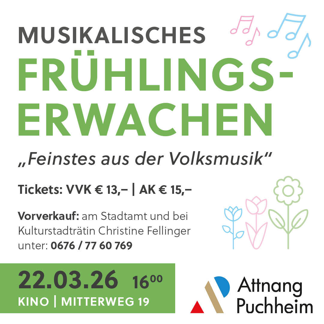 Musikalisches Frühlingserwachen 2026 – Feinstes aus der Volksmusik in Attnang-Puchheim Wenn der Winter langsam weicht und die ersten warmen Sonnenstrahlen durchbrechen, heißt es in Attnang-Puchheim wieder: Zeit für das Frühlingserwachen! Am Sonntag, 22. März 2026 um 16:00 Uhr laden wir herzlich zu einem besonderen musikalischen Nachmittag ein, der den Frühling auf traditionelle Weise willkommen heißt. Durch das Programm führt mit gewohntem Schmäh und viel Charme Moderator Peter Gillesberger, der mit seiner humorvollen Art für beste Unterhaltung sorgen wird. Musikalisch dürfen sich die Besucherinnen und Besucher auf echte Volksmusik-Schmankerl freuen – live auf der Bühne stehen: